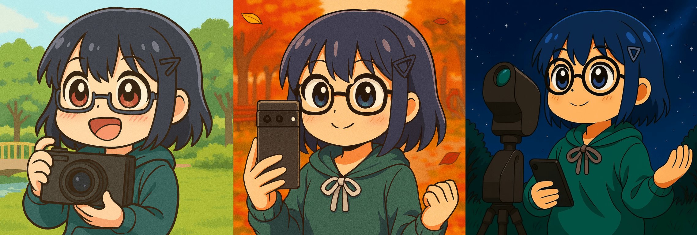 | スナップ、日常、望遠、暗所、星空、マクロ | Pixel 9 Pro | Google製の高性能スマートフォン。AIによる画像補正が強力で、暗所や星空でも鮮明に撮影可能。マクロ撮影にも対応し、日常のスナップから望遠まで幅広くこなす。スマートフォンとして常に持ち歩けるため、シャッターチャンスを逃さず即座に撮影・SNS共有ができる。 | 約11万~15万円 |