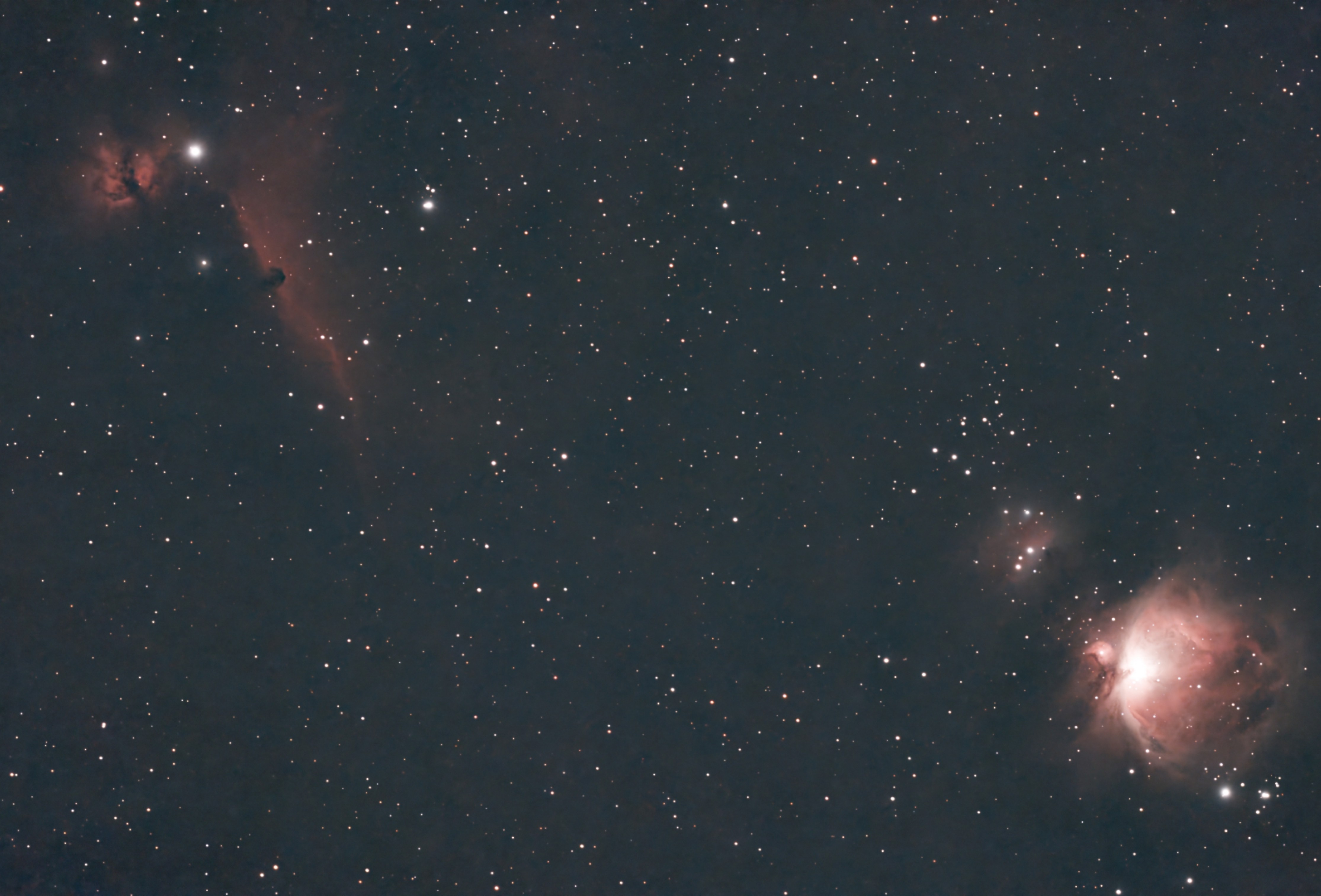 | 馬頭星雲(IC434) | その名前の通り、馬の頭に似た形で有名な暗黒星雲です(写真中央部)。1888年にハーバード大学天文台の写真観測によって初めて発見されました。赤い領域は散光星雲(IC434)です。赤い散光星雲(IC434)の手前にある巨大な暗黒星雲の一部が被って馬の頭の形に見えています(つまり、馬の頭はIC434自身の形状ではない)。散光星雲(IC434)は、暗黒星雲の背景にある水素ガスが近くにあるオリオン座σ星からの紫外線を受けて電離して赤く輝いております。 |