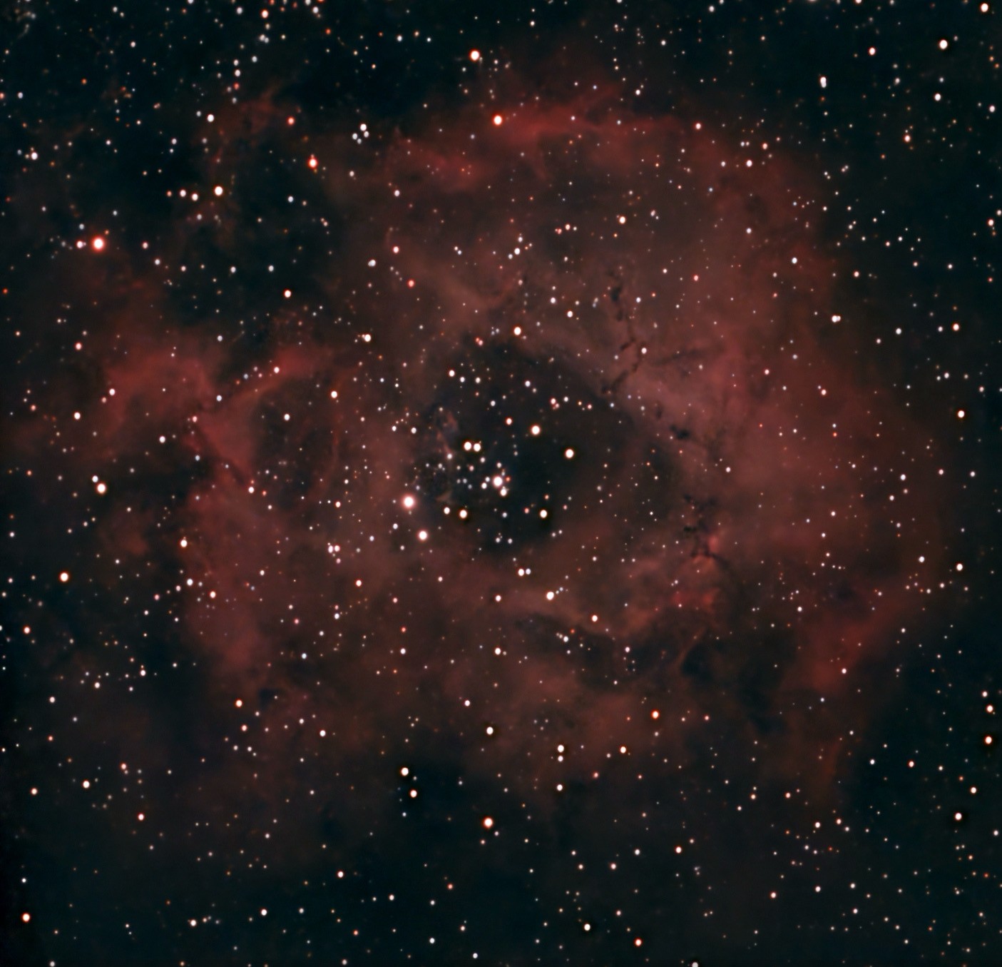 バラ星雲 (The Rosette Nebula 、NGC 2237-9, 2246、Caldwell 49)は、いっかくじゅう座に位置する美しい散光星雲です。名前のとおり、赤いバラのような美しい姿をしています。バラ星雲は、中心部にある散開星団NGC 2244を取り囲むように広がっています。眼では感じにくいHα線の成分が強い天体であるため、肉眼で見ることは難しいです。