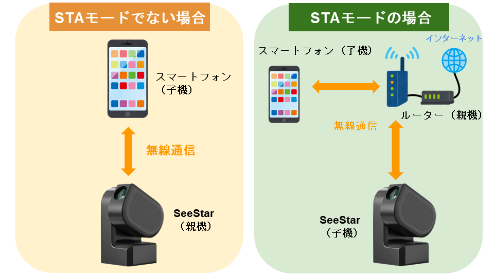 STAモードでは、Wi-Fiルーター(2.4Ghz帯のみ)を経由してスマートフォンとSeeStarを無線接続します。