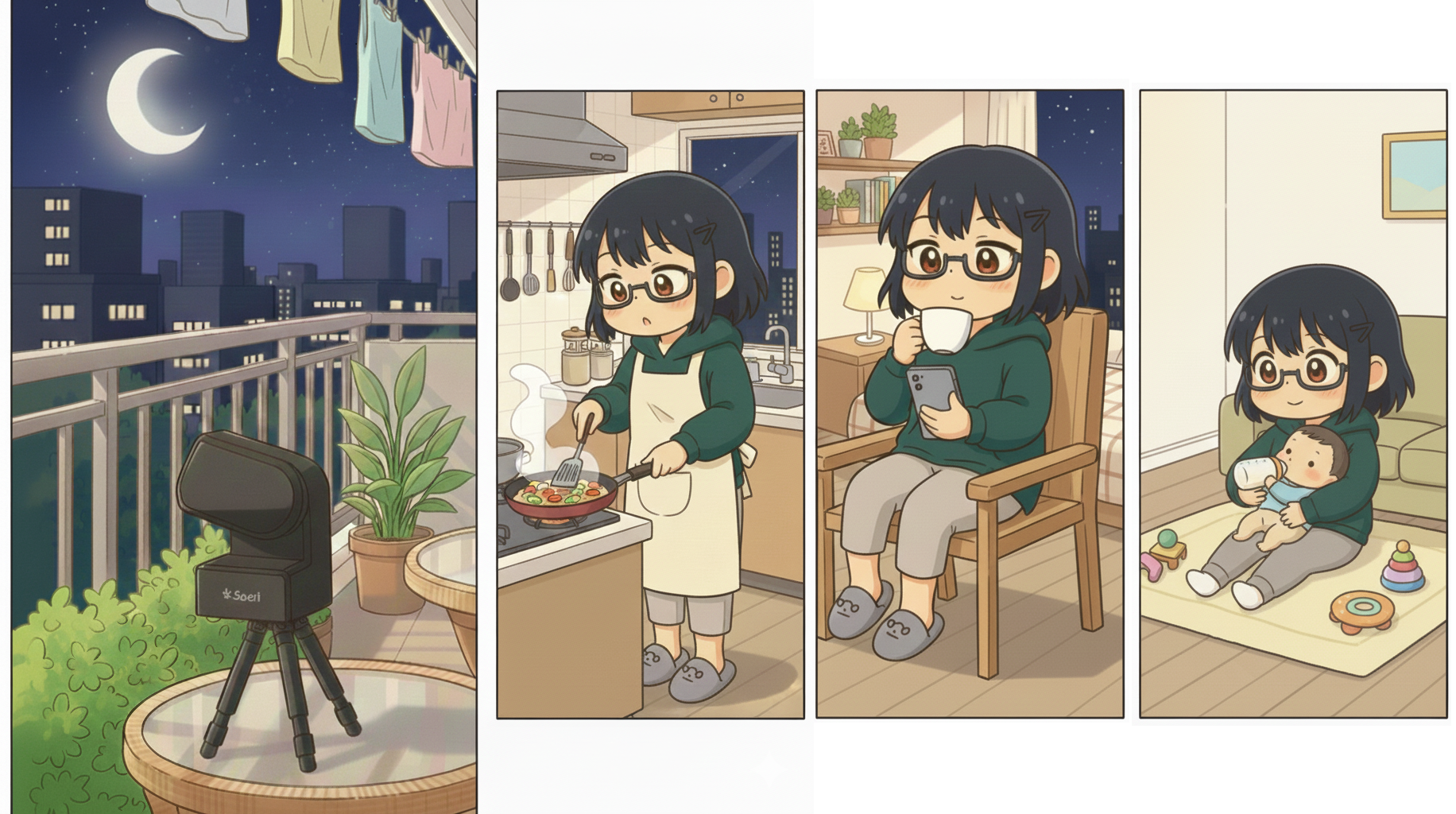 従来の本格的な天体撮影は、深夜に郊外へ遠征したり、長時間の機材準備や撮影開始後の操作が必要でした。そのため、仕事・家事・育児との両立は厳しく、生活リズムを崩しやすい趣味でした。