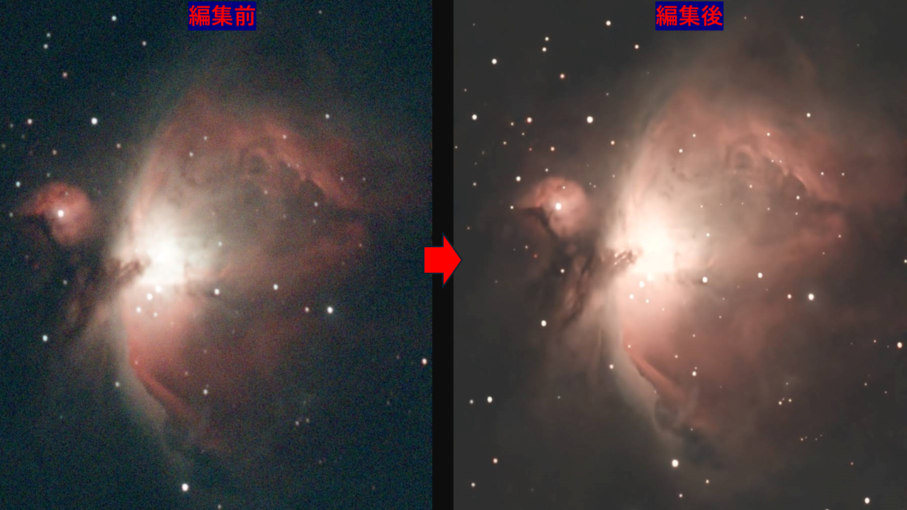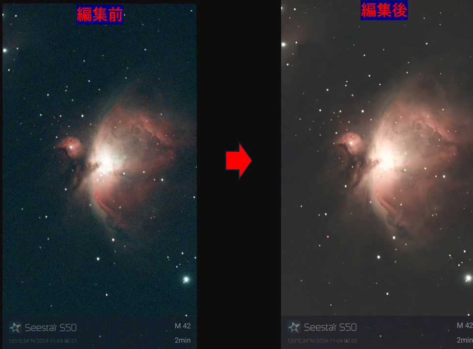 V2.2.1から実装された「AIノイズ除去(AI Denoise)」は、強力な背景ノイズ除去と簡単な画像処理(**明るさ、コントラスト、色彩の調整やクロップ)ができます。以下の写真は、オリオン大星雲(M42)の天体写真にAIノイズ除去機能を適用したものです。